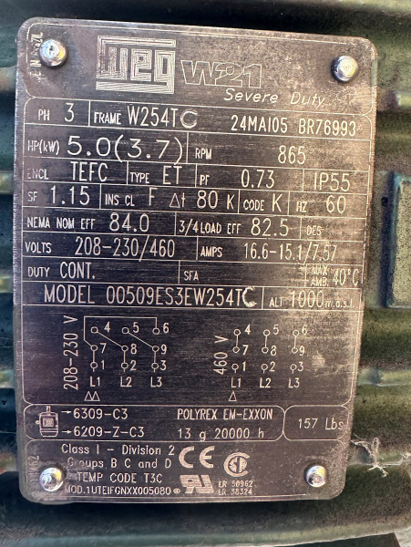 Tank has a top center mounted LIGHTNIN Series 10 mixer with a 5 HP 208-230-460 V TEFC 3 PH 865 RPM WEG electric motor.