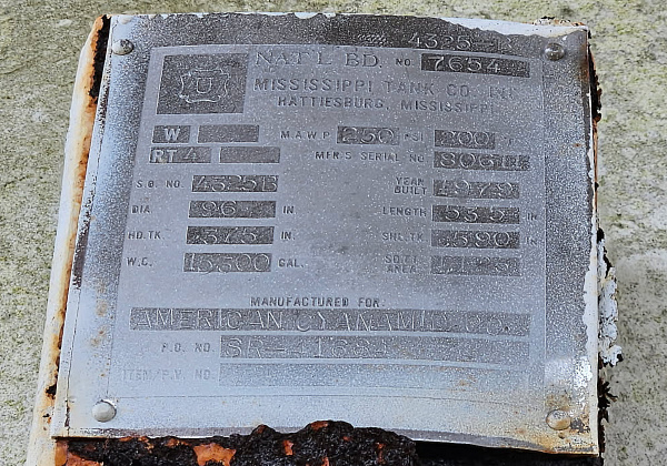 Manufactured by Mississippi Tank Co in Hattiesburg, MS in 1979.